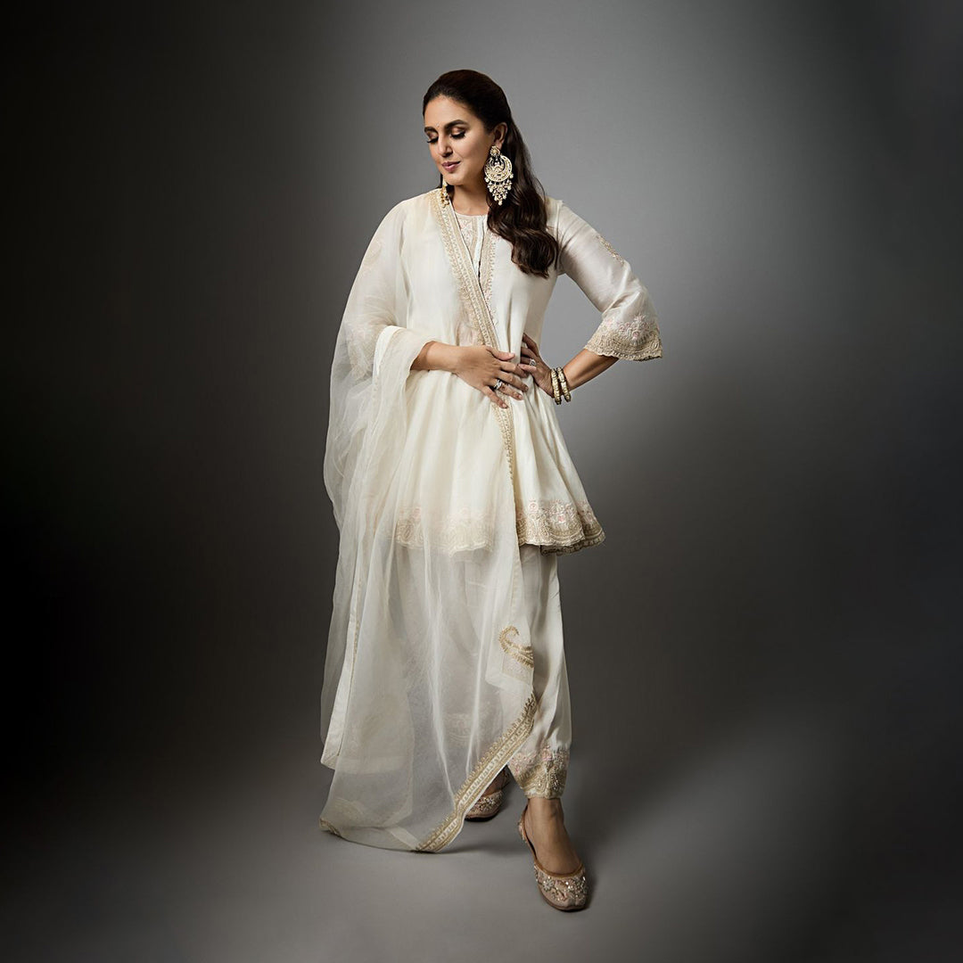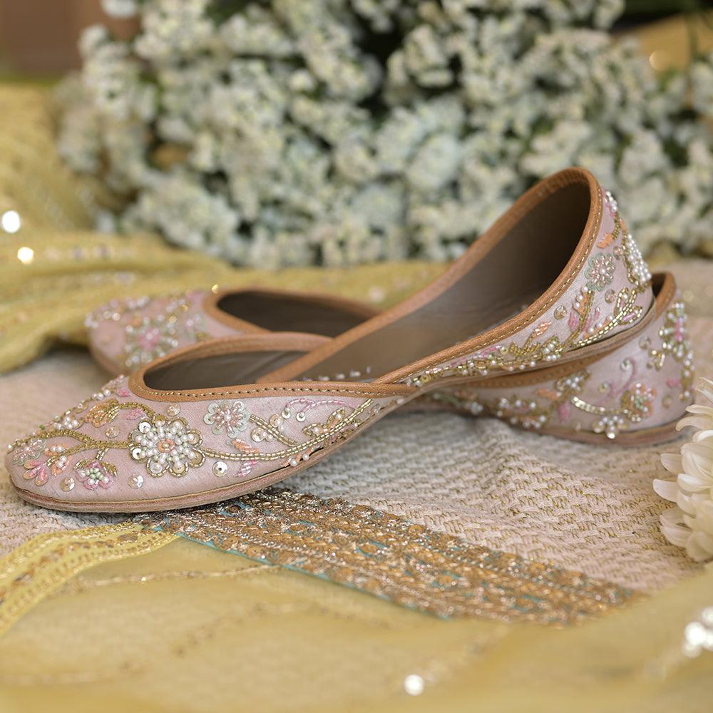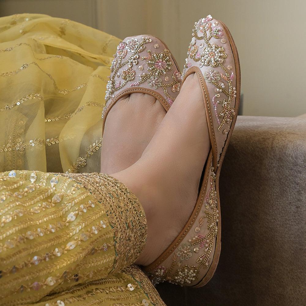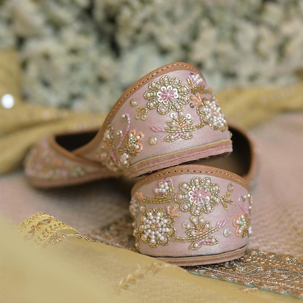 Hand embroidered bead work jaal set in a multi colored floral pattern on a nude colored base
