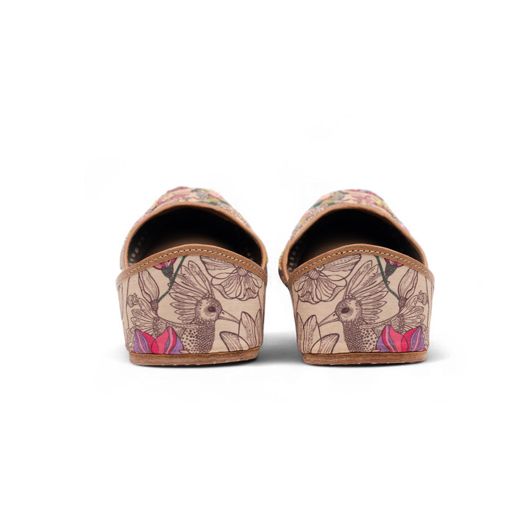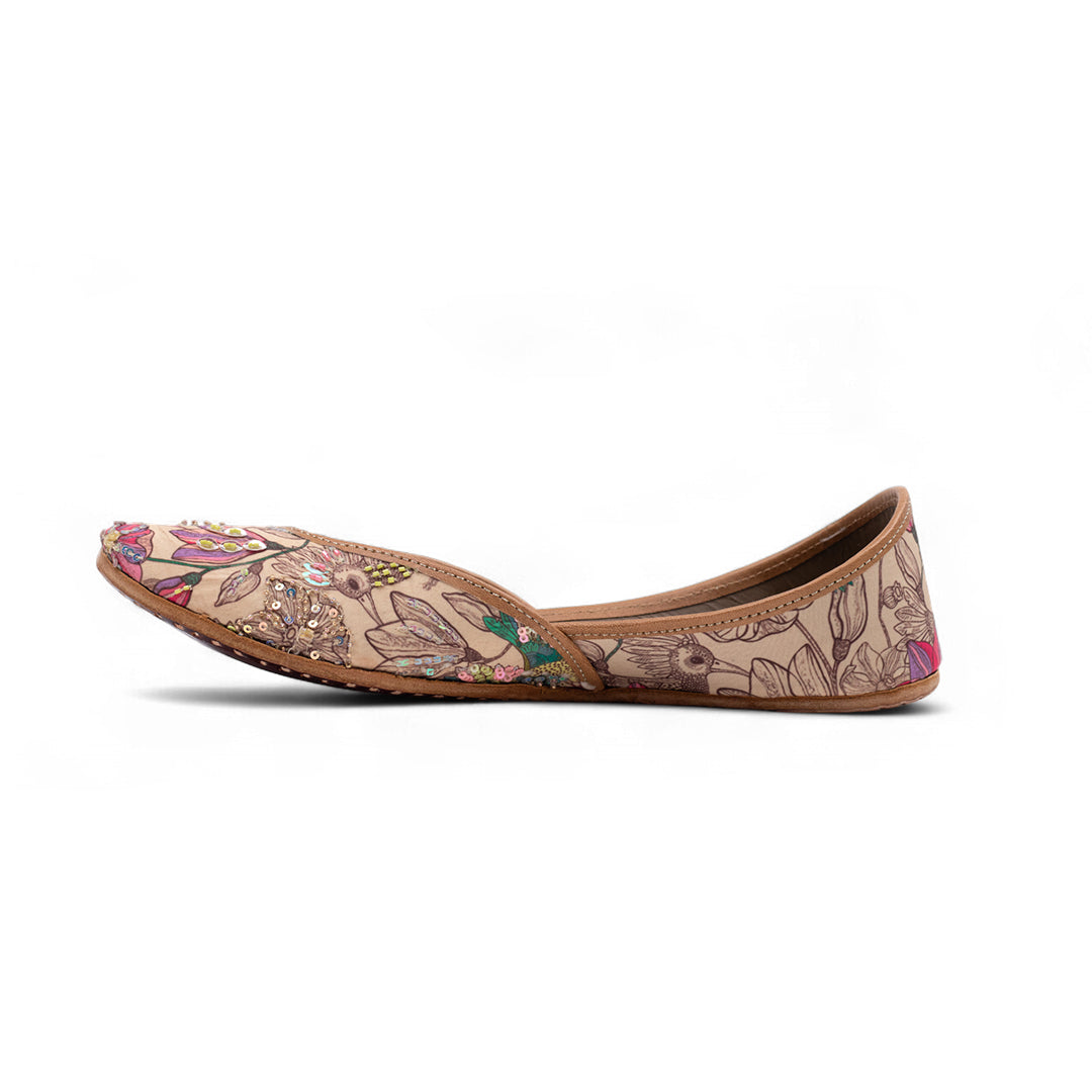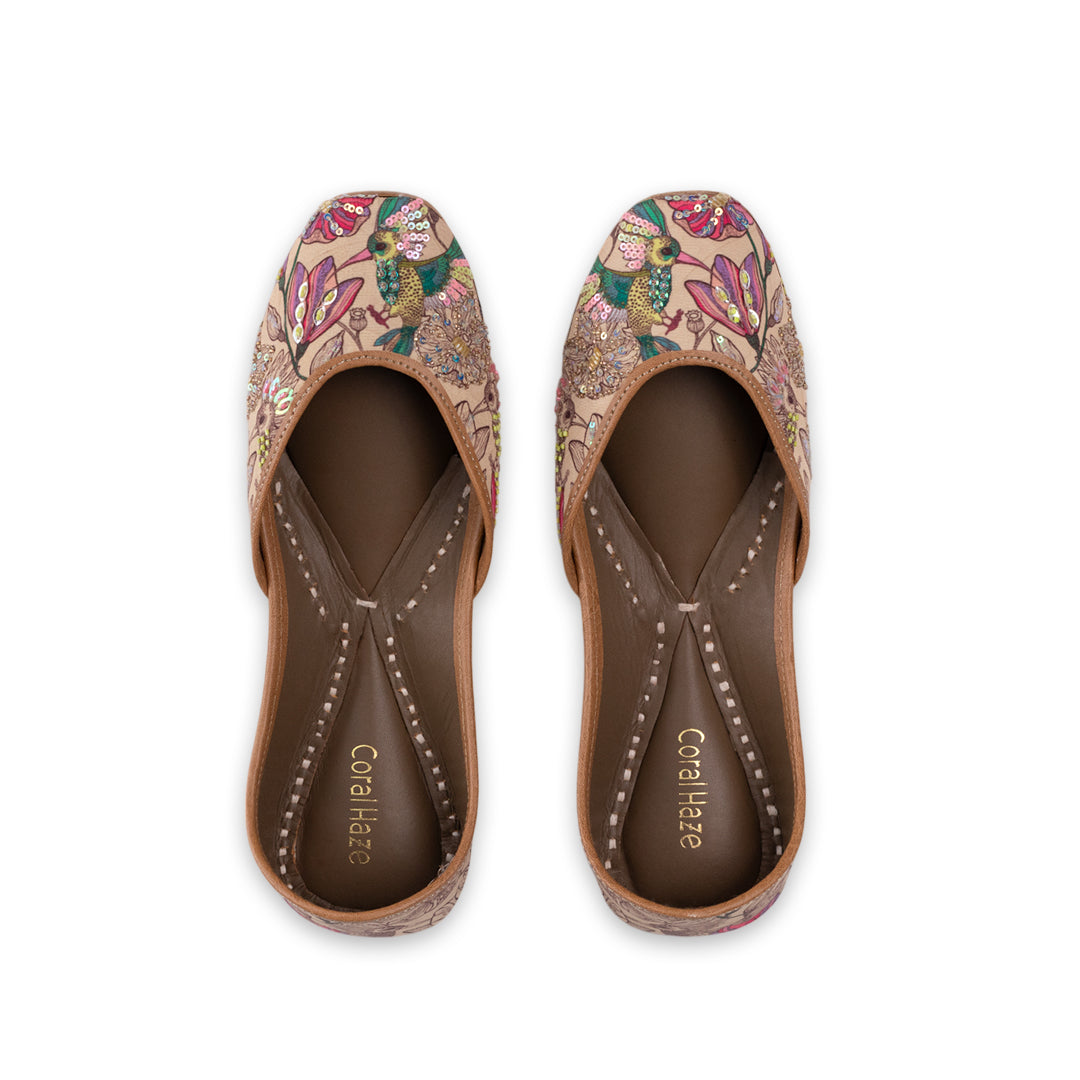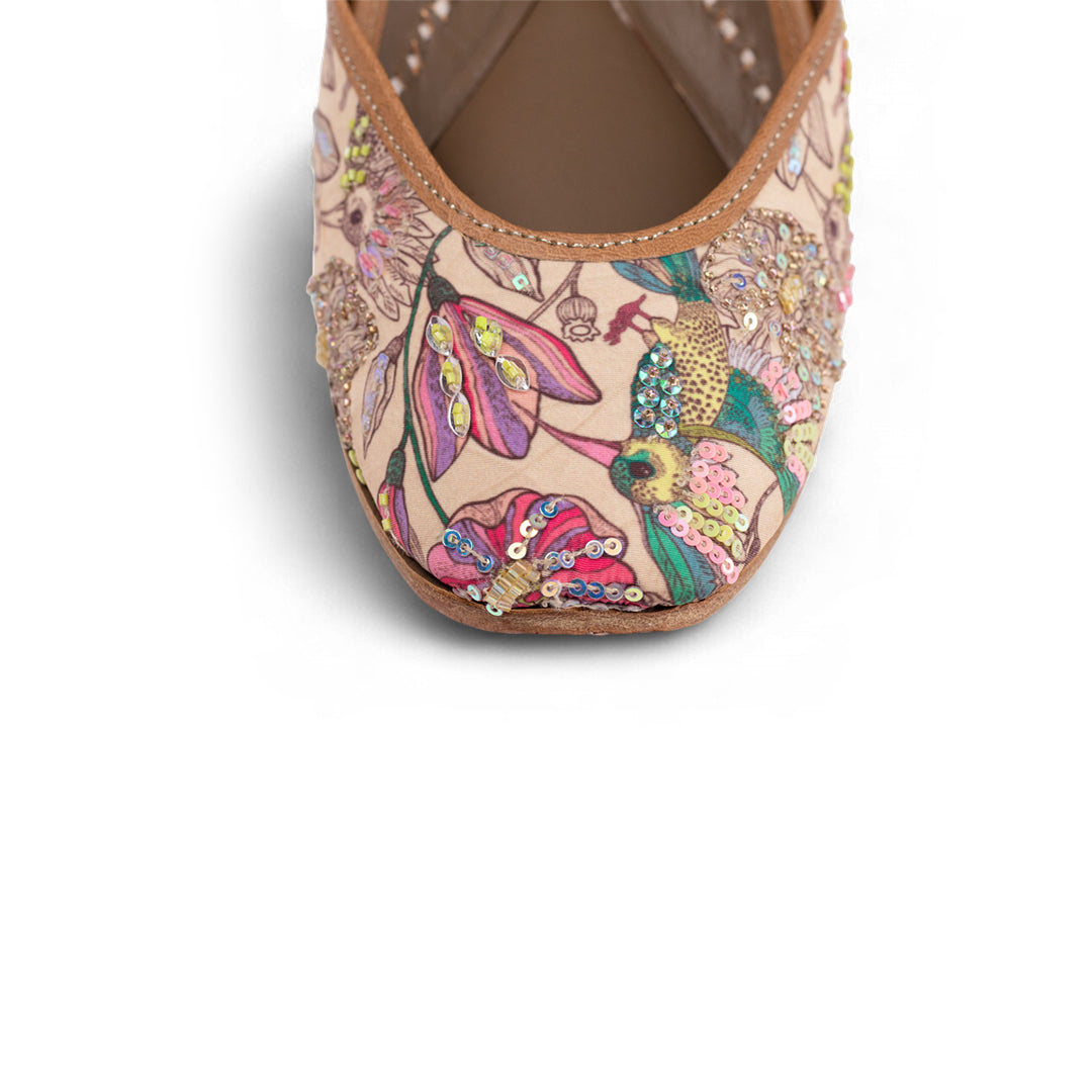 Beige floral and bird print juttis with hand embroidered sequins and beadwork