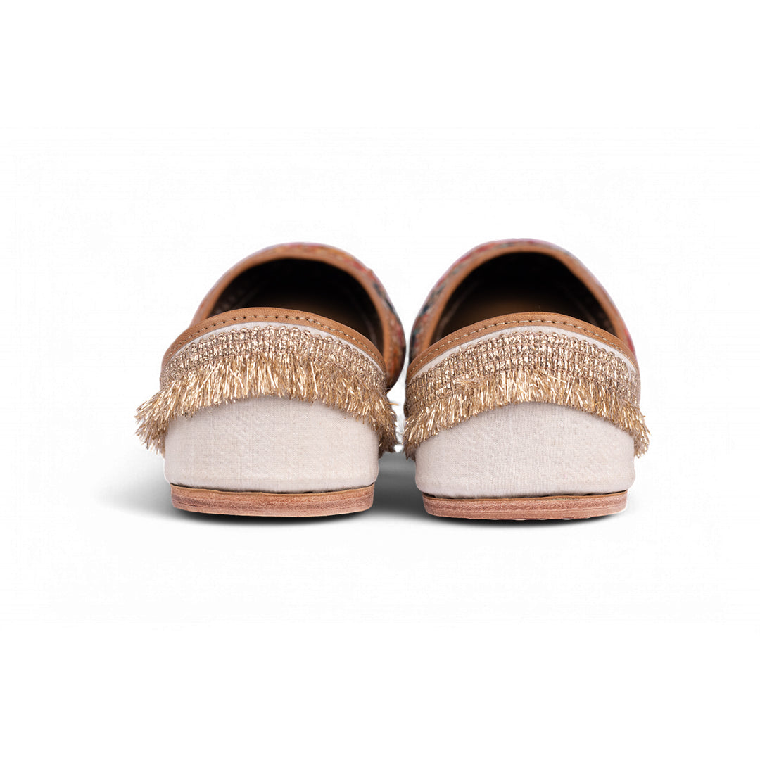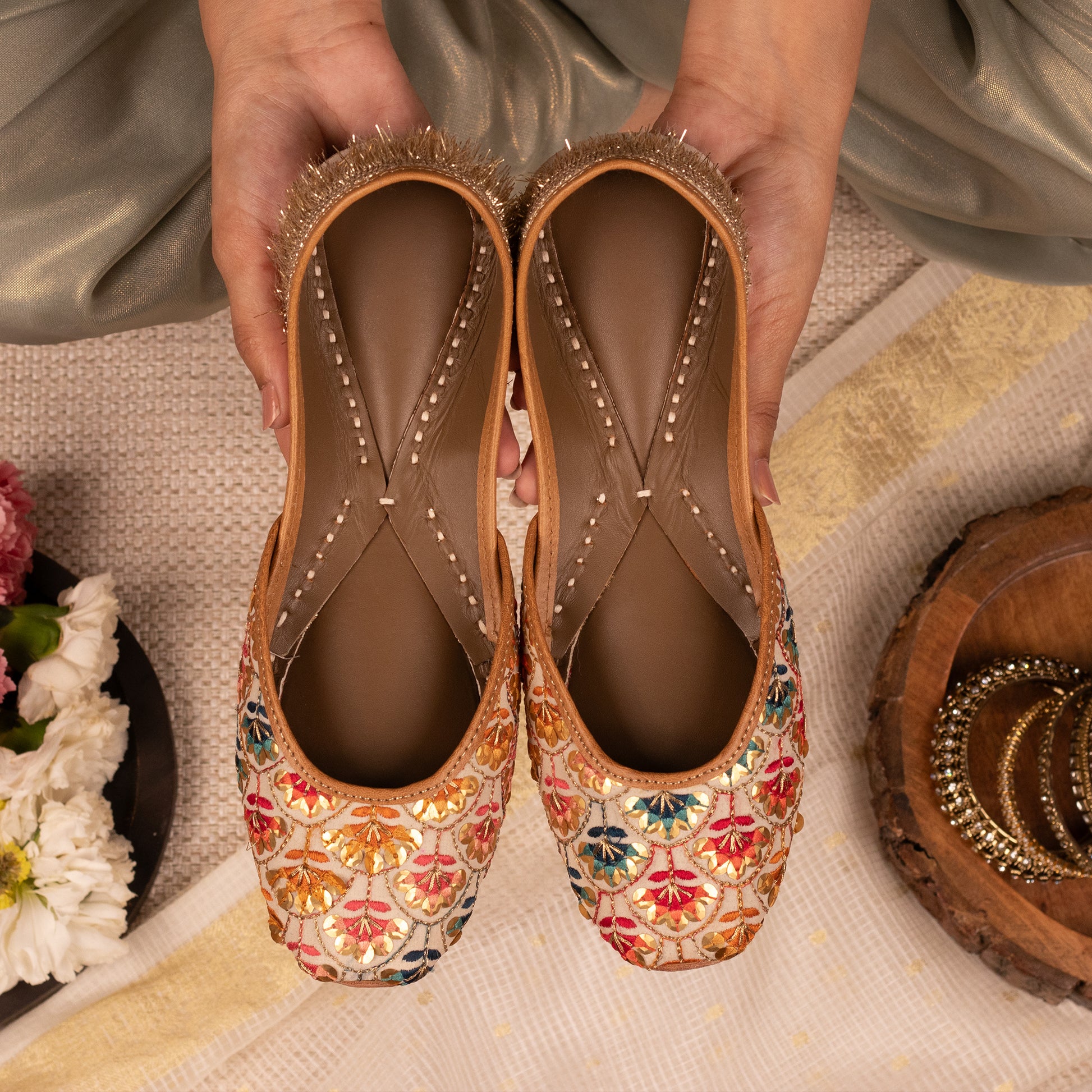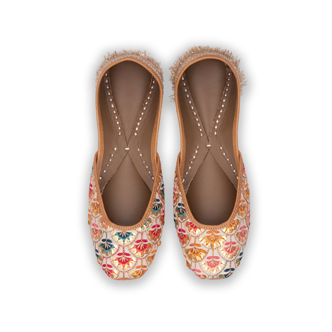 Ivory juttis with multi colored threadwork motifs and golf fringe detailing at the back