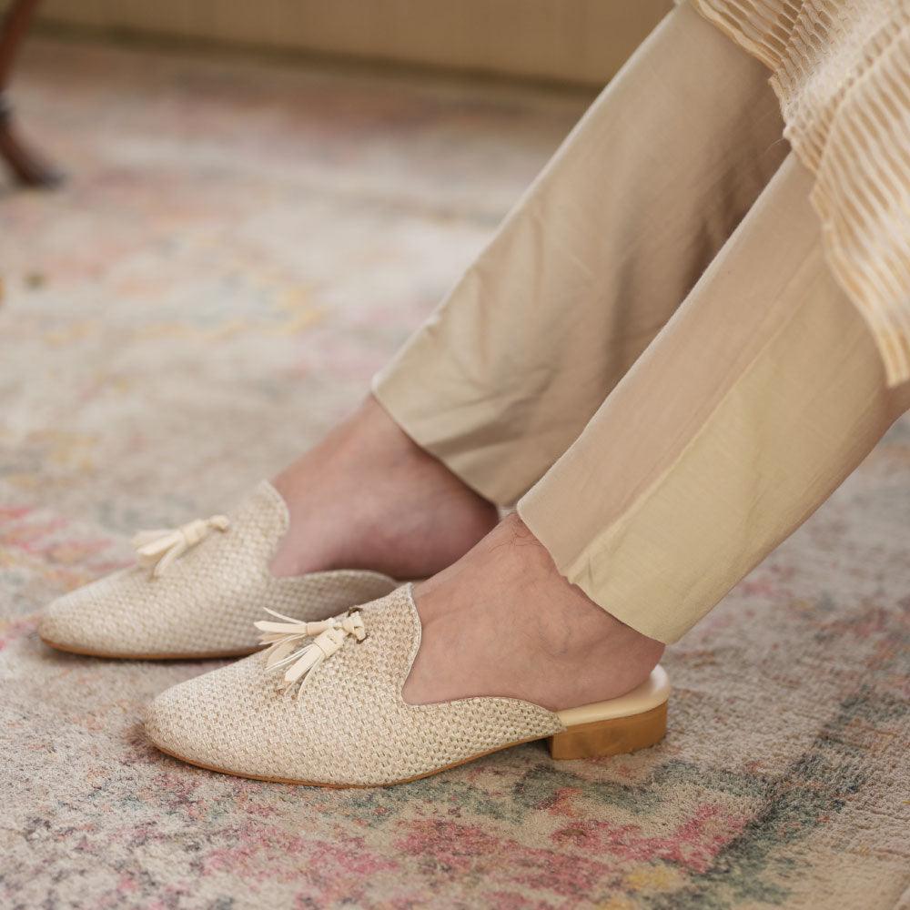 Introducing "Zephyr" ’??? elevate your style with our ivory patterned jacquard mules, a perfect fusion of sophistication and comfort. Crafted in faux leather, these mules feature intricate ivory tassel detailing, a cushioned sole, and a chic tan heel.
